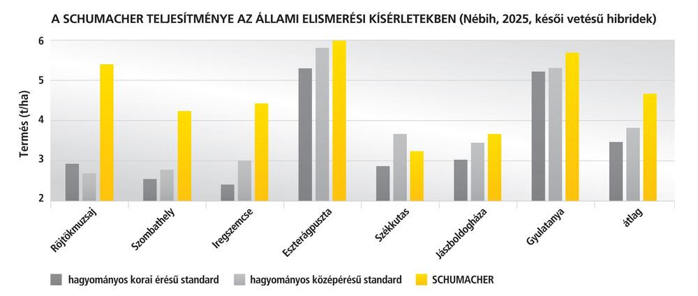 SCHUMACHER hibridünk mind nitrogénhasznosításban, mind pedig aszálystressz-toleranciában kimagaslóan teljesít, későbbi vethetősége és korábbi betakaríthatósága közel egy hónappal rövidebbé teszi a vegetációs időszakot és ezáltal csökkenti a kockázatot is. Optimális esetben a tavasz végén tapasztalható forróság és aszálystressz beállta előtt megtörténik a hozampotenciál felépítése, amit a növény remekül meg is tud tartani.