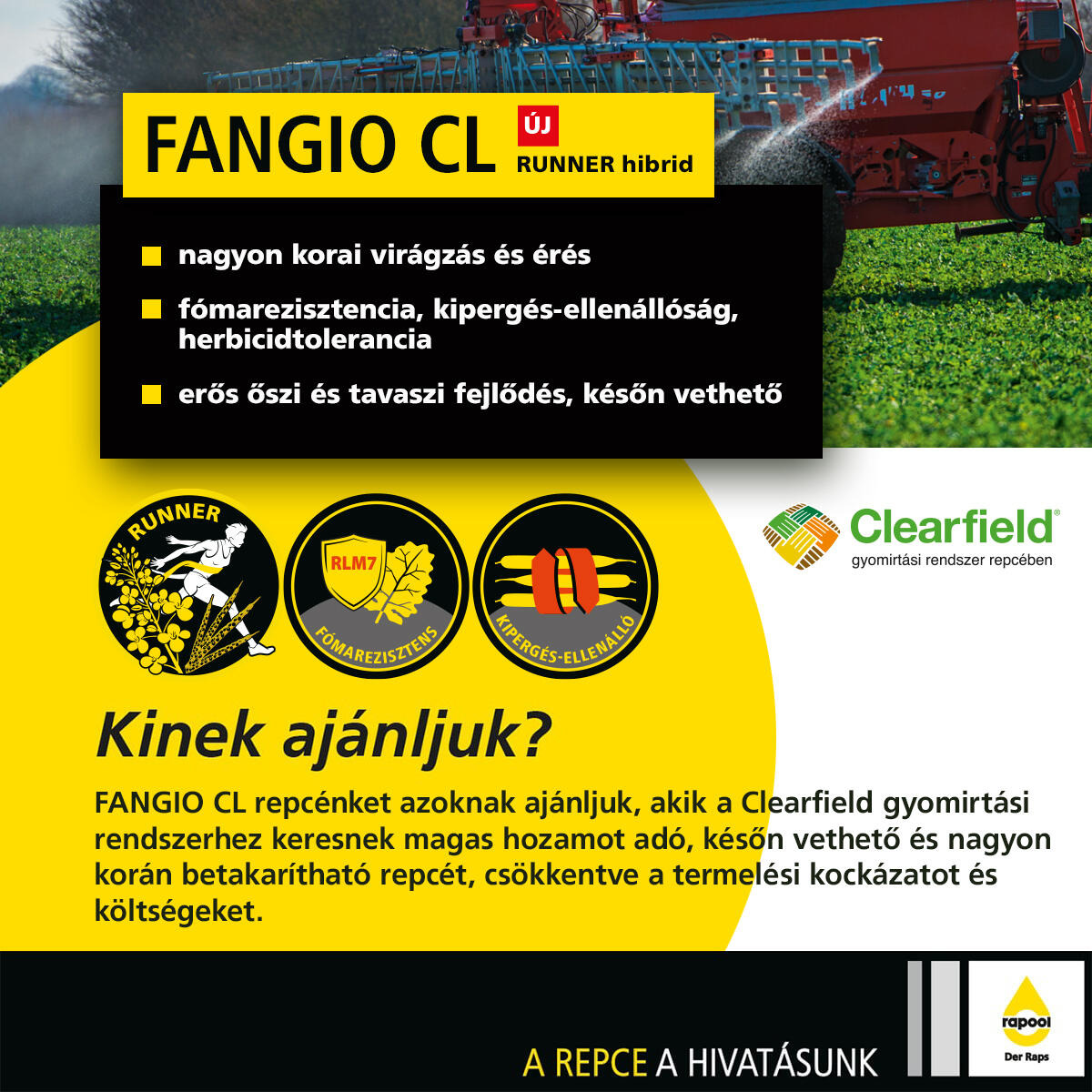 A FANGIO CL, az első RUNNER típusú Clearfield-hibridünk. Őszi fejlődési erélye erőteljes, így megkésett vetésekre bizonyítottan alkalmas. Hozampotenciálja magas, olajtermése és olajtartalma kiváló. Télállósága átlag feletti, virágzása és érése pedig nagyon korai, a hagyományos korai érésű repcehibrideket átlagosan 2 héttel előzi meg. Koraisága miatt betakarítása jól ütemezhető, alacsony-közepes növénymagassága miatt könnyen aratható.