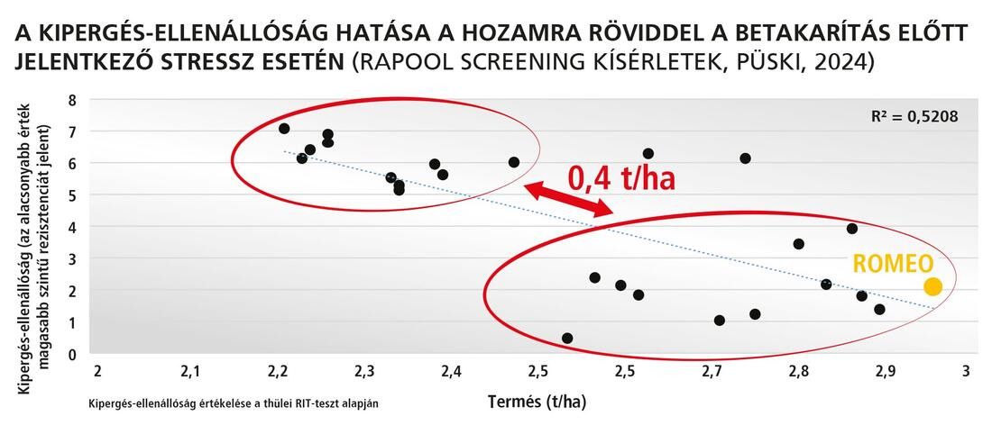 A modern hibridek másik legfontosabb ismérve a kipergés-ellenállóság, mely segítséget jelent a repcebetakarítás ütemezésében is. Ezen fajtatulajdonsággal a betakarítás rugalmasan időzíthető, elkerülve a munkacsúcsok kialakulását. Nagy biztonságot jelent, hogy ha az utóbbi években a repceérés idején gyakran érkező viharok miatt megkésik a betakarítás, a hibridek hozamstabilitása akkor is magas marad, és minimális a pergési veszteség. A RAPOOL minden hibridje, így az újak is – a korai érésű DAHLIA és a középérésű ROMEO – rendelkeznek ezzel a tulajdonsággal.