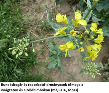 Javaslat: A teljesen bevirágzó repcében jelenleg az óriási egyedszámban betelepedő repcebecő-ormányos jelent növényvédelmi gondot. A rovarölő szeres védekezések csak rövid időre képesek mérsékelni az egyedszámukat. A hatalmas fertőzési nyomást az évek óta felszaporodó ormányospopuláció és a hosszabb tartamhatást biztosító hatóanyagok kivonása okozza. Az imágók jelenleg táplálkoznak és párzanak a virágokban, az este becsukódó virágok védelmet nyújtanak az éjjeli permetezéskor használt piretroid hatóanyaggal szemben. A becőormányosok számára a becők fejlettsége rövidesen alkalmas lesz a peterakásra – az imágók ellen még ezelőtt kell védekezni! A permetezésre a méhekre nem jelölésköteles acetamiprid és tau-fluvalinát hatóanyagot ajánljuk. A repcefénybogár érzékeny kárt már nem okoz, de a bundásbogár népességét figyelni kell.