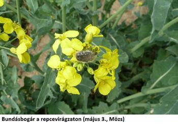 Mözsön a méhek járják a táblát, a kezeletlen részen sok a bundásbogár. A repcebecő-ormányos tömegesen fordul elő, a virágokba húzódva táplálkoznak és párosodnak. A képződő kis becők a tojásrakáshoz még fejletlenek, de rövidesen megindul a peterakás. A kezelt táblarészben is erős a becőormányos-fertőzöttség, a repcefénybogár a virágszirmokban mérsékelt egyedszámban található meg. A fűhálózás eredményei (db/5x10 hálócsapás átlaga, kezelt/kezeletlen): 0,8/0 repceszárormányos, 16,4/8,2 repcefénybogár, 46,4/31,0 repcebecő-ormányos, 2,8/0,6 bundásbogár, 3,6/1,4 bársonylégy. Repcebecő-gubacsszúnyogot még sem a növényzeten, sem a fűhálóban nem láttunk. A nagyszámú repcebecő-ormányos miatt a rovarölő szeres kezelés sürgősen elvégzendő! Az imágók becőkártételükkel rövidesen súlyos gazdasági kárt okozhatnak.
