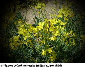 Bonyhádon egységesen virágzik a tábla, hangosan zúgnak a méhek. A virágokban temérdek repcebecő-ormányos és kevesebb repcefénybogár-imágó táplálkozik, az ormányosok párzanak. A képződő becőkön fúrást vagy peterakási nyomot egyelőre nem észleltünk. A fűhálózás eredményei: 12,0/7,6 repcefénybogár, 32,2/19,6 repcebecő-ormányos, 1,4/0,6 bundásbogár, 1,2/0,6 bársonylégy. Repcebecő-gubacsszúnyogot egyik táblarészen sem figyeltünk meg.