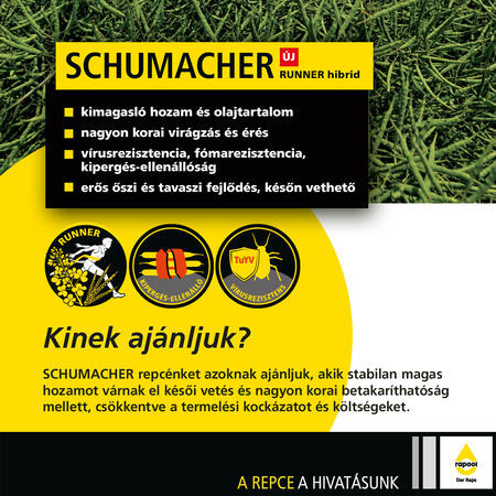 - Kiváló betegség-ellenállóság és alkalmazkodóképesség: A RUNNER hibridek ugyanazokat a rezisztenciagéneket hordozzák (pl. tarlórépa-sárgaságvírus, fóma és cilindrospóriumos betegség ellen), mint a nagy teljesítményű őszi káposztarepce-hibridek.