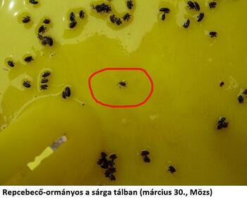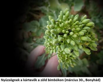 Javaslat: Az utóbbi hét meleg, száraz tavaszi időjárása a repce fejlődését meggyorsította. A táblákon elvégzett rovarölő szeres kezelések nyomán a célkártevők egyedszáma jelentősen csökkent, veszélyes egyedszám sehol sem fordul elő. Ahol még nem védekeztek a szárormányosok ellen, a súlyos kártétel elkerülése érdekében azonnal pótolják! Mindenhol megjelent és növekedésnek indult a repcefénybogár-populáció és megkezdődött a repcebecő-ormányos betelepedése is. A következő napokon várható esőzés és a lehűlés a kártevők népességét nem növeli, így a következő kezelés még nem időszerű.